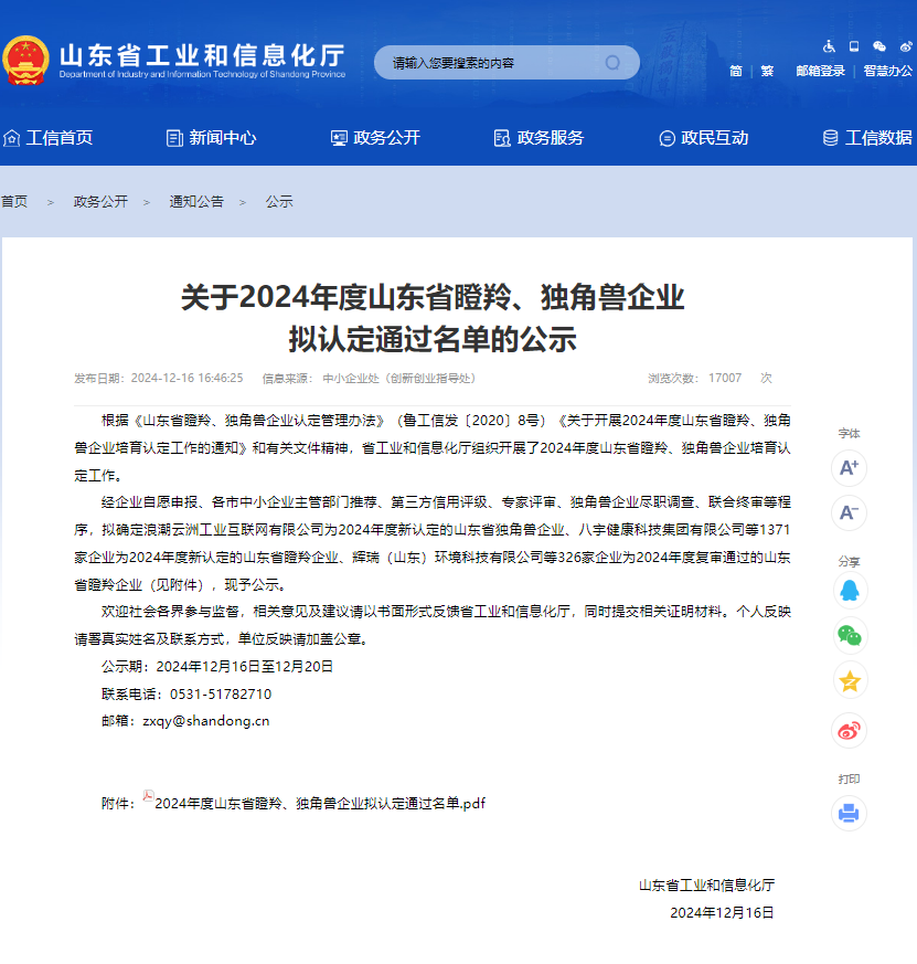 2024年12月16日,煙臺國工智能科技有限公司獲評2024年度新認定的山東省瞪羚企業(yè)。