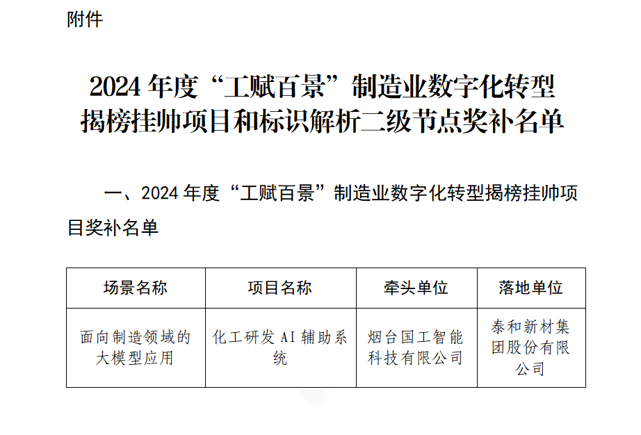 6月3日,省工信廳發(fā)布《關(guān)于2024年度“工賦百景”制造業(yè)數(shù)字化轉(zhuǎn)型揭榜掛帥項目和標(biāo)識解析二級節(jié)點獎補(bǔ)公示名單》,作為全省33個通過驗收的項目之一,由國工智能與泰和新材揭榜掛帥的面向制造領(lǐng)域的大模型應(yīng)用——“化工研發(fā)AI輔助系統(tǒng)”項目榜上有名。