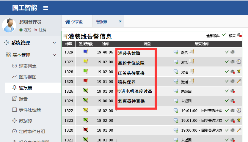 1、通過設備數字化網絡的建立采集各目標設備的工藝數據、故障報警,啟停狀態、生產節拍等設備運轉數據到實時數據庫。