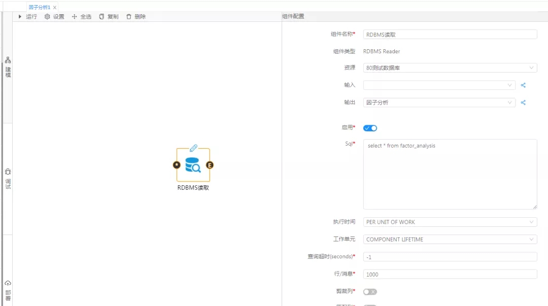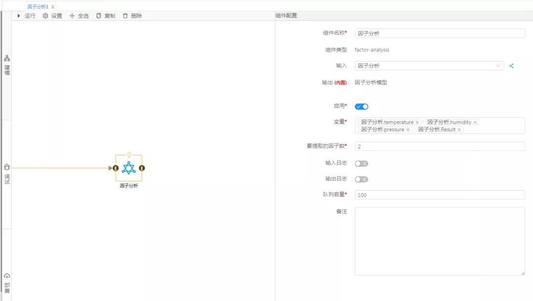 使用集成好算法的因子分析組件進行數據的因子分析處理,對組件參數進行設置,變量字段配置為溫度、濕度、壓強、實驗結果,因為共有4個變量,所以要提取的因子數配置為2,單擊運行,從調試面板中查看分析結果。
