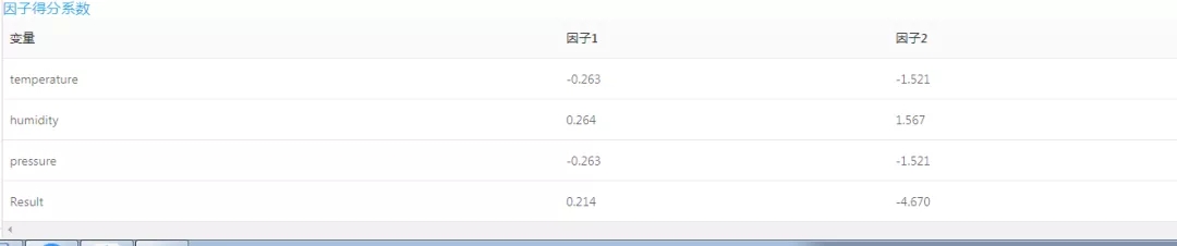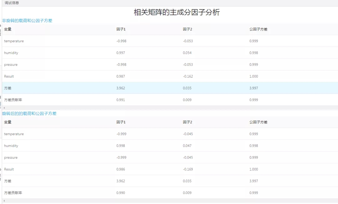 濕度(0.998)和結果值(0.986)在因子1上具有較大的正載荷,溫度(0.999)、濕度(0.998)、壓強(0.999)和結果值(1)在因子3上具有較大的正載荷,所以這兩個因子共同解釋數據變異的0.999或99.9%。
