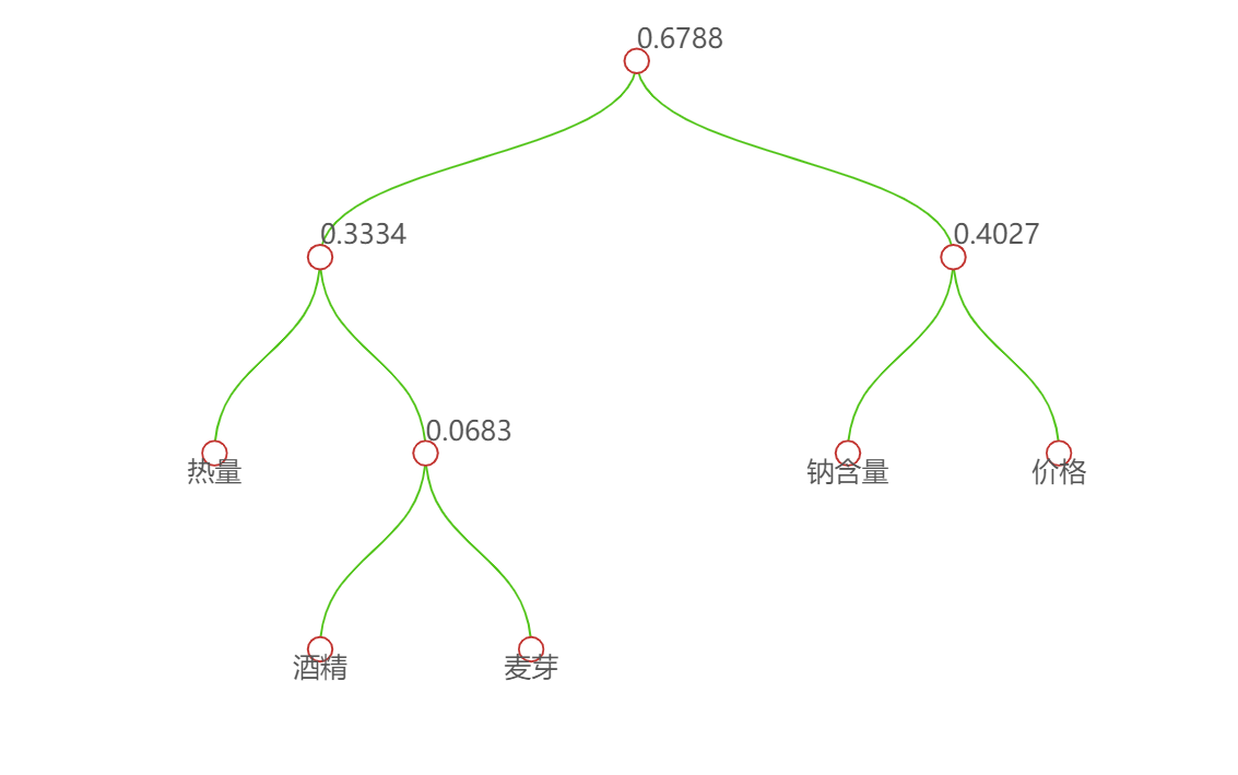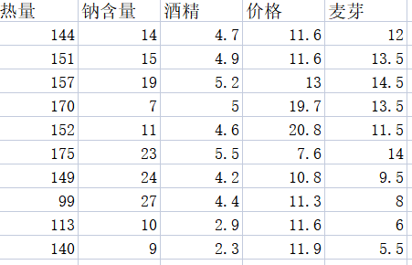 從結果樹狀圖中可以看出酒精含量與麥芽濃度兩個變量距離為0.0683,二者之間相關系數最大(相關系數等于1 - 距離)選其一即可,沒有必要都作為預測變量,導致成本增加。至于酒精含量和麥芽濃度選擇哪一個作為典型指標來代替原來的兩個變量,可以根據專業知識或測定的難易程度決定。(與因子分析不同,是完全踢掉其中一個變量以達到降維的目的。)這里選用酒精含量,至此,確定出用于預測的變量為:酒精含量,鈉含量,熱量,價格。