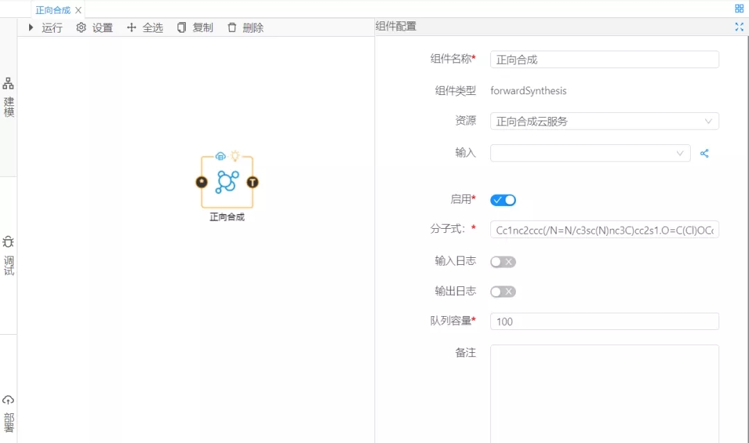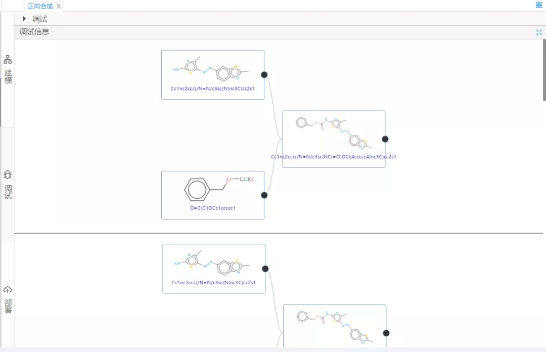 然后,進行組件配置。資源項選擇正向合成云服務,分子式填入參與反應的相關反應的SMILES表達式,并按照相應規則填入,如圖2所示。最后點擊調試,當顯示運行成功時即表示運行預測算法成功,平臺會將預測結果展現給用戶,結果如圖3所示。