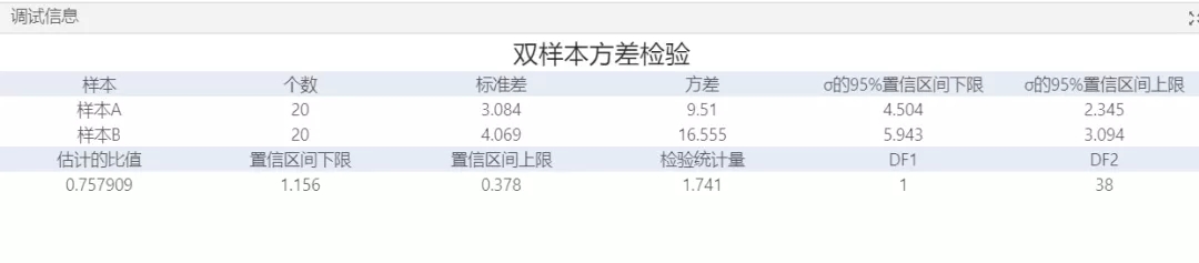 通過雙樣本方差檢驗來判斷兩個組的方差或標(biāo)準(zhǔn)差是否不同,并計算可能包括兩個組的方差或標(biāo)準(zhǔn)差的總體比值的值范圍,通過對樣本的標(biāo)準(zhǔn)差和方差比的95%置信區(qū)間來判斷該組數(shù)據(jù)是否具有比較有效性,以及通過p值來判斷結(jié)果的可信程度從而推斷該假設(shè)是否可以成立。