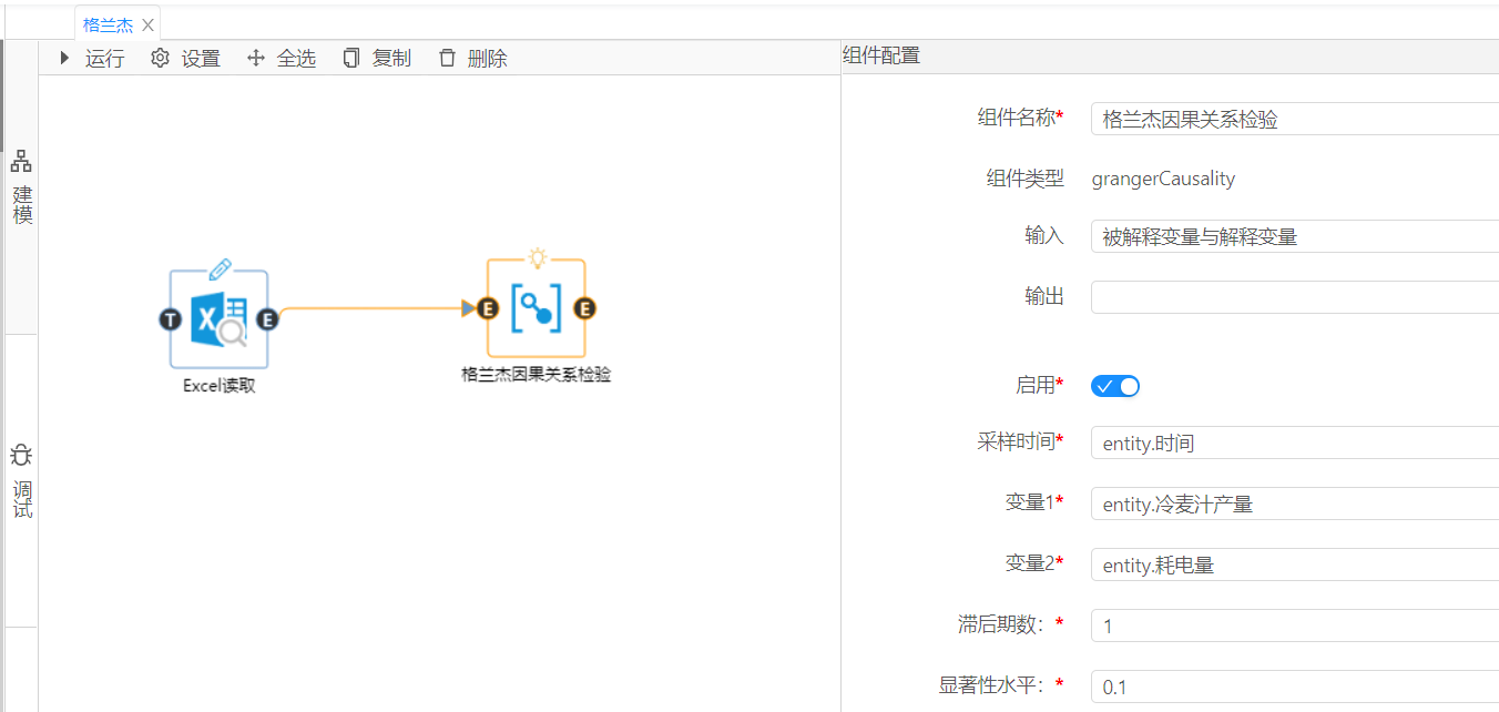 首先,從數據大腦中的組件面板搜索格蘭杰因果關系檢驗組件,拖到到工作面板,配置數據及組件參數:滯后期數選擇1,顯著性水平選擇0.1,點擊運行。過程如圖1: