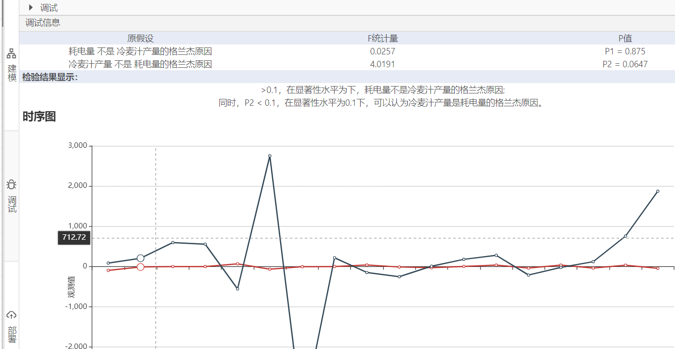 下表是某啤酒企業2005-2009年各個季度冷麥汁的產量和制冷耗電量的數據,該時間序列數據經過差分處理是平穩的,符合格蘭杰因果檢驗的前提。利用AIC信息準則確定最優階數是1,接下來將使用國工數據大腦已經集成好的格蘭杰因果關系檢驗算法對數據進行雙向因果關系檢驗,即檢驗冷麥汁的產量是否為制冷耗電量的格蘭杰原因及制冷耗電量是否為冷麥汁產量的格蘭杰原因。