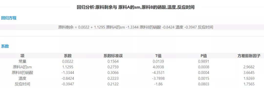由圖2可知,關(guān)于擬合優(yōu)度檢驗方面,決定系數(shù)R-sq(即R方)=0.7526,說明該模型擬合優(yōu)度較好,因變量Y與自變量X1,X2,X3,X4具有較高的線性相關(guān)關(guān)系。從圖3可知:對于F檢驗,查F分布表可知,顯著性水平為0.1所對應(yīng)的F臨界值是2.31,F(xiàn)檢驗統(tǒng)計量的值為5.5,故F統(tǒng)計量的值>臨界值,拒絕原假設(shè)。說明整個回歸模型是有效的,所有自變量整體對Y有影響。對于t檢驗,由圖2 顯示,在0.1的顯著性水平下,四個自變量的p值分別為:          p1=0008;p2=0.004;p3=0.0015;p4=0.0803,均小于0.1,故拒絕原假設(shè),進一步表明每一個自變量對Y有顯著影響。綜上,所有結(jié)果顯示此回歸模型通過了統(tǒng)計意義的檢驗,說明此四元線性回歸模型是成立的,可以用于預(yù)測。已知a1=1.130,a2=-1.334;a3=-0.842;a4=-0.395。最終的多元線性回歸方程為:Y=0.002+1.1295 X1-1.3344 X2-0.8424X3-0.395 X4此方程的意義是:在假定其它自變量不變的情況下,原料A的SM(X1)每增長1g,原料剩余就增長1.1295g;在假定其它自變量不變的情況下,原料B的硝酸(X2)每增長1g,原料剩余就減少1.3344g;在假定其它自變量不變的情況下,溫度(X3)每提高1攝氏度,原料剩余就減少0.8424g;在假定其它變量不變的情況下,反應(yīng)時間(X4)每提高1秒,原料剩余就減少0.395g;同時,回歸系數(shù)a的絕對值越大,對Y的影響越大,可以看出a2的絕對值最大,為1.334。在決策方面,若該企業(yè)想減少原料剩余率,應(yīng)當(dāng)多關(guān)注原料B的情況。在預(yù)測方面:若下一次實驗時,假設(shè)X1=1.260,X2=-0.371,X3=-0.670;X4=0.770,則Y的預(yù)測值=0.002+1.1295*1.260-1.3344*(-0.371)-0.8424*(-0.670)-0.3947*0.770=2.179(g)。即原料剩余為2.179g,該企業(yè)可以將其與上一次實驗進行比較,從而進行相應(yīng)的決策。