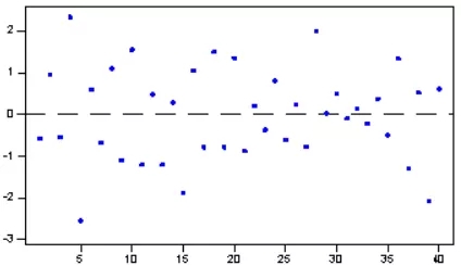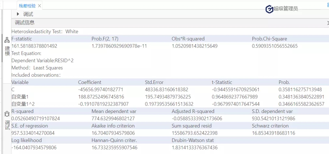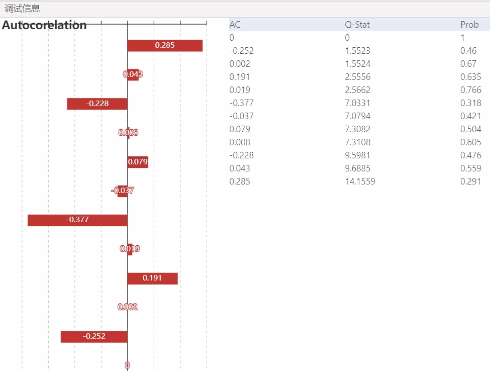 根據(jù)圖11可知,懷特檢驗統(tǒng)計量的值為1.052,它也服從自由度為2的卡方分布,在0.1的顯著性水平下,其臨界值=4.605,懷特檢驗統(tǒng)計量值<臨界值,接受原假設,該殘差序列存在方差相等的情況。