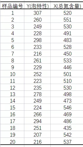 化工、釀造等裝置性行業(yè)的過程控制,往往是多變量共同作用。為了做好過程控制,實現(xiàn)“以因素管理結果",我們運用回歸分析的統(tǒng)計技術尋找規(guī)律,并用于生產(chǎn)過程控制。例如,啤酒釀造過程中成品啤酒的泡特性(秒),是直接關系到啤酒口感的技術要求。技術和經(jīng)驗表明中間產(chǎn)物的總氮含量X對于需要滿足的泡沫時間Y (秒)有影響。數(shù)據(jù)如下: