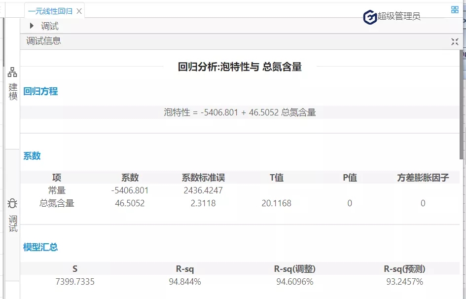 在下一批生產(chǎn)中,若X(總氮含量)=130,則Y(泡特性)的預測值=-5406.801+46.51*130=639.3(秒),以此類推,能夠預測到未來若干次生產(chǎn)中的成品啤酒的泡特性,可通過降低總氮含量等措施控制啤酒的泡特性,從而實現(xiàn)生產(chǎn)控制,實現(xiàn)效益最大化的目標。(具體預測及回歸模型含義國工數(shù)據(jù)大腦多元線性回歸在化學研發(fā)成本的預測一文)