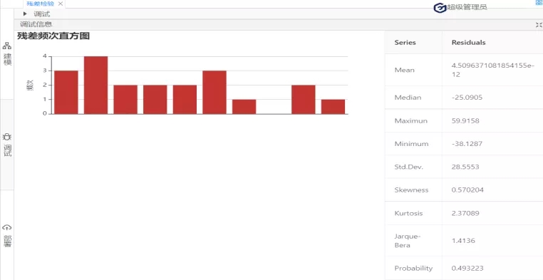 接下來,進行殘差檢驗的第二個方面:殘差序列正態(tài)性檢驗。(原假設:序列服從正態(tài)分布)在診斷方法下拉列表選擇:Histigram-Normality-Test;如圖3: