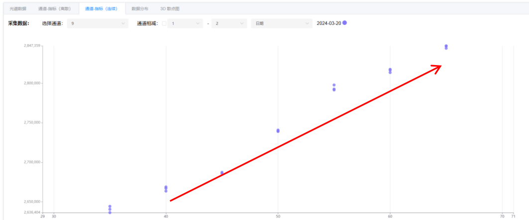 由圖4可知,乙二醇含量在紫外-可見光區域(波長250-800nm)的相關性較高,為0.99,躁信比低于0.2%。通過檢查該波段的落點圖,發現有較好的線性關系,落點圖如下圖所示: