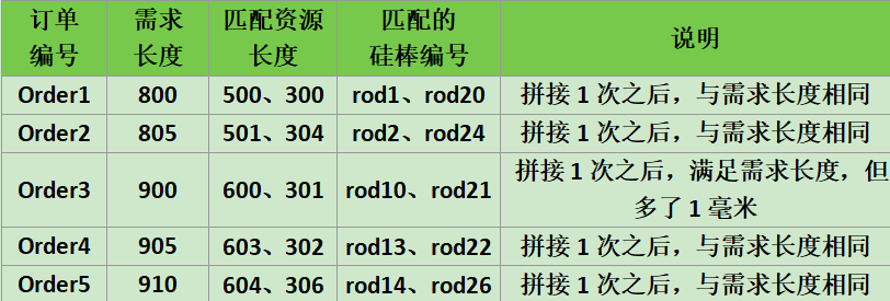 舉個(gè)例子,有50 個(gè)需求,倉(cāng)庫(kù)中有1000個(gè)原料,要在材質(zhì),規(guī)格,長(zhǎng)度需求上滿足需求,可拼接,但是每個(gè)硅棒需求最多允許拼接2次,可以超長(zhǎng),但是超長(zhǎng)的部分不可超過(guò)50mm,超長(zhǎng)的部分越少越好。