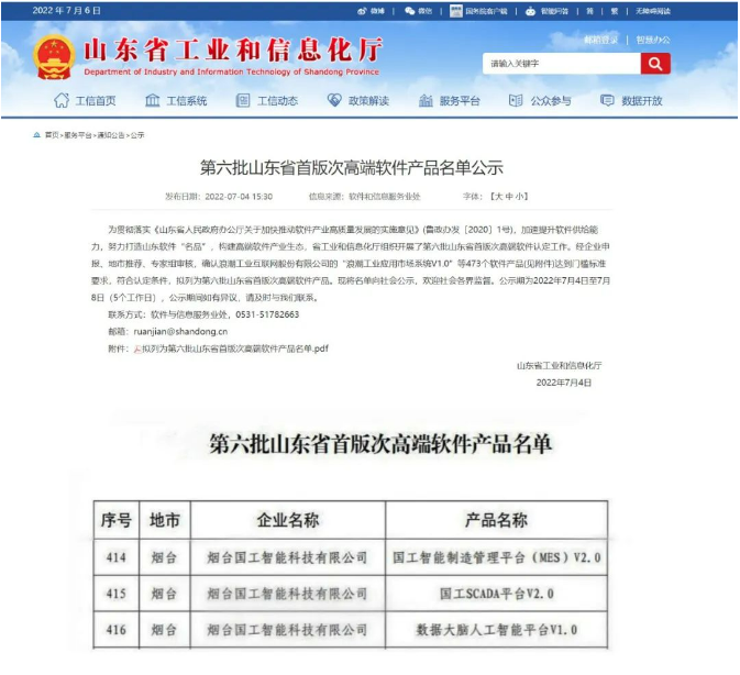 7月4日,山東省工信廳公示了第六批山東省首版次高端軟件產品名單,煙臺國工智能科技有限公司自主研發的“數據大腦人工智能平臺V1.0”、“國工智能制造管理平臺(MES)V2.0”、“國工SCADA平臺V2.0”三款軟件產品同時成功入選,是煙臺市獲批數量最多的專業軟件企業。