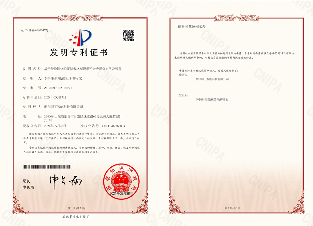 近日,國工智能新添國家知識產權局頒發的一項發明專利證書“基于經驗網絡的蒙特卡洛樹搜索逆合成規劃方法及裝置”。